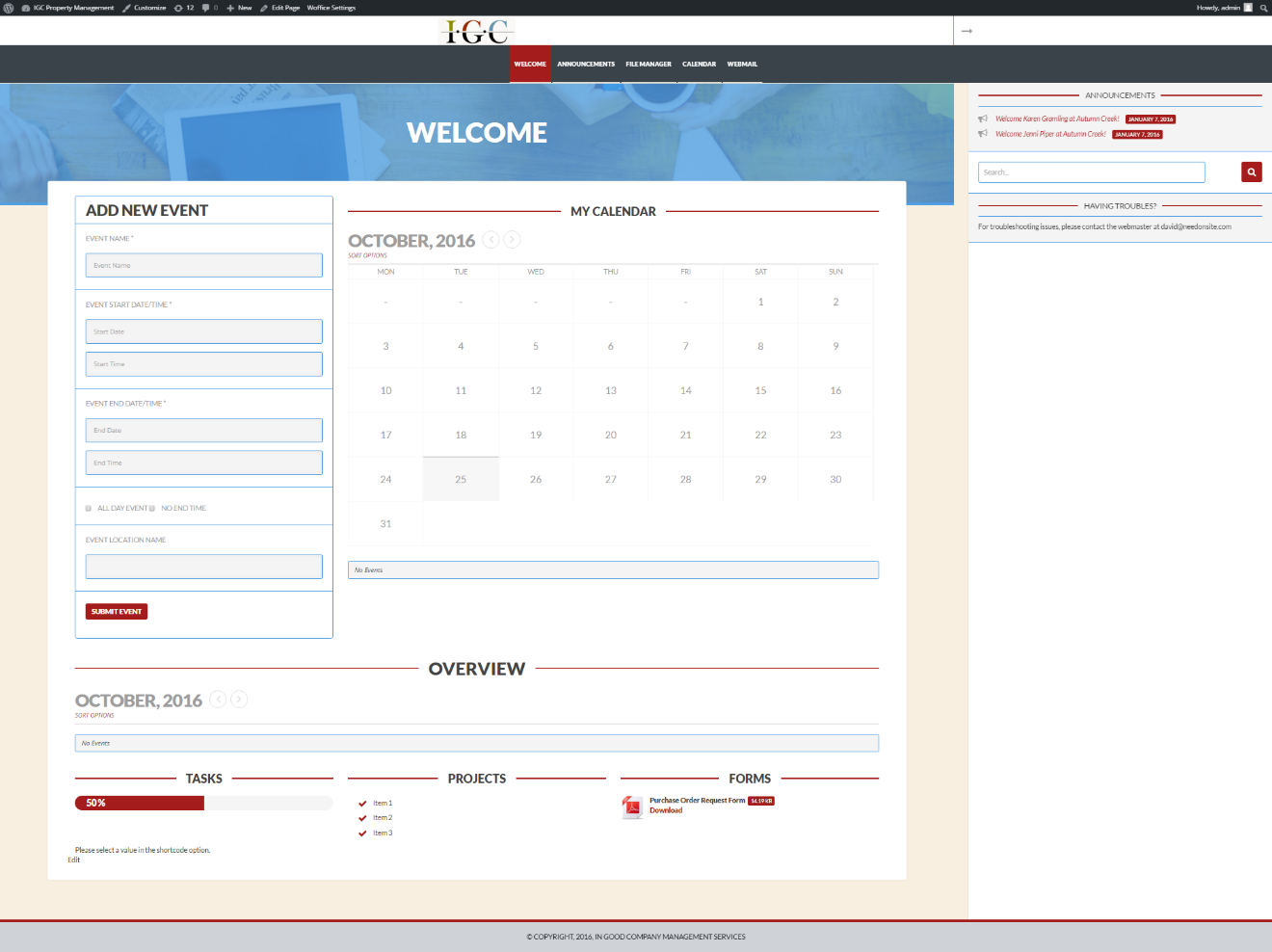 Available to employees-only, In Good Company Property Management executives can access a company calendar, post announcements from corporate, download standardized forms and make common requests from one of their dozen properties throughout Indiana.