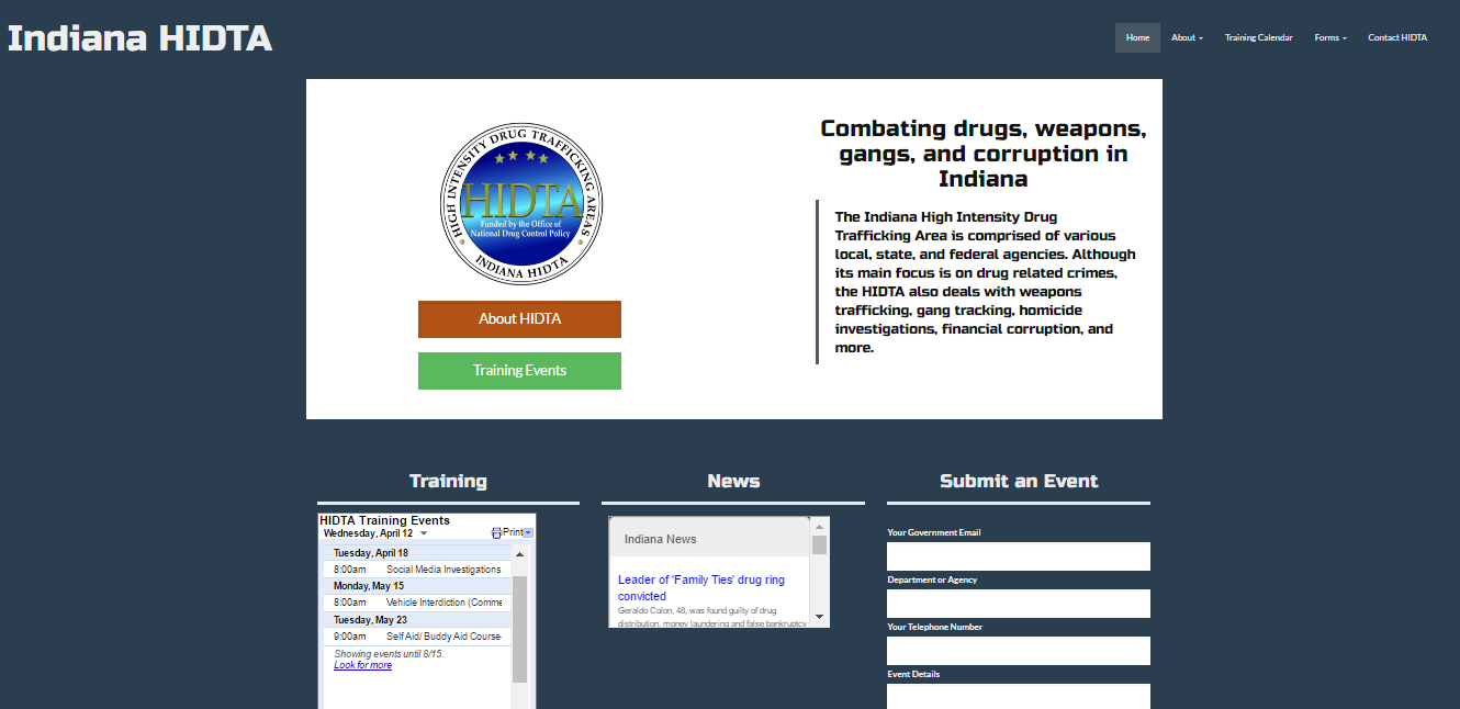 In addition to serving as a front-end for the public to learn more about the HIDTA initatives and departments, a calendar of training events is integrated into the site so that the public and law enforcement can learn about and register for upcoming training events associated with the Indiana HIDTA.